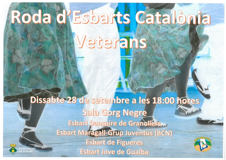 Portada > Actualitat > Agenda > Roda d'Esbart Catalònia Veterans Roda d'Esbart Catalònia Veterans Dia i hora: dissabte 28/09/2019 a les 18:00h Lloc: Sala Gorg Negre Organitza: Esbart Jove de Gualba Amb la participació de: Esbart Dansaire de Granollers Esbrat Maeragall-Grup Juventus (BCN) Esbart de Figueres