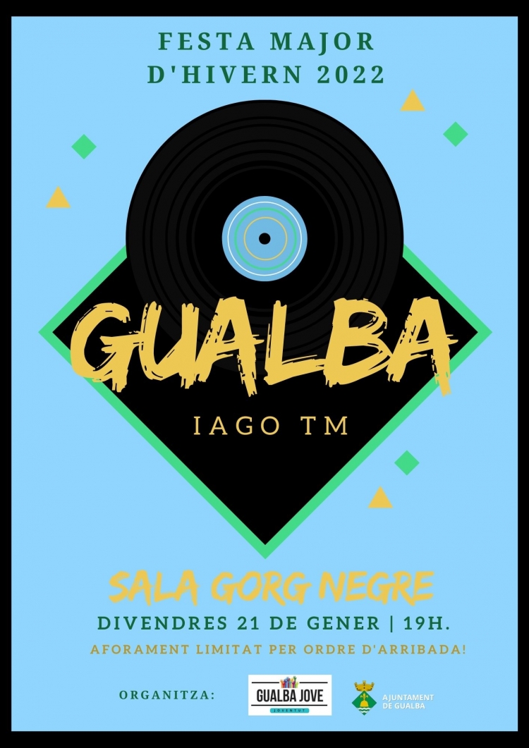 Portada > Actualitat > Agenda > Concert IAGO TM FESTA MAJOR HIVERN 2022 Concert IAGO TM FESTA MAJOR HIVERN 2022 Dia i hora: divendres 21/01/2022 a les 19:00h Lloc: Sala Gorg Negre Organitza: Espai Jove Ajuntament de Gualba Aforament limitat segons ordre d'arribada!