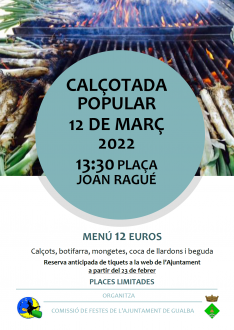 Portada > Actualitat > Agenda > Calçotada popular 2022 Calçotada popular 2022 Dia i hora: dissabte 12/03/2022 a les 13:30h Lloc: Plaça Jona Ragué Organitza: Comissió de Festes de l'Ajuntament de Gualba Menú 12 euros Venda d'entrades a partir del 24 de febrer al següent enllaç: ENTRADES EXHAURIDES Places limitades