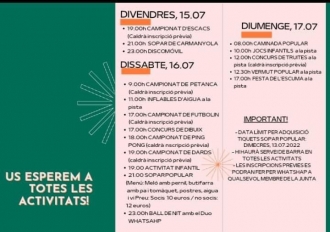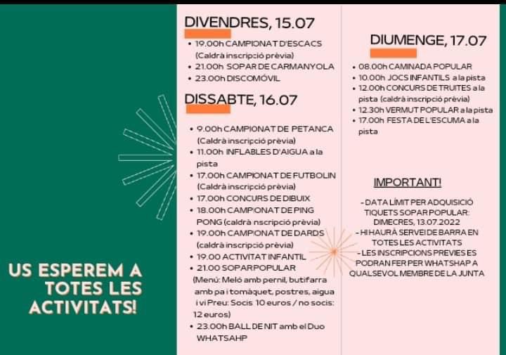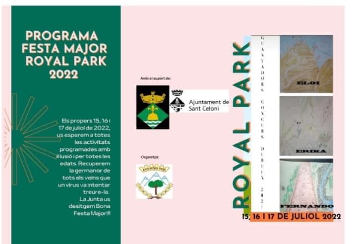 Portada > Actualitat > Agenda > Festa Major de Royal Park Festa Major de Royal Park Dia i hora: Del divendres 15/07/2022 al diumenge 17/07/2022 Organitza: Associació de Veïns de Royal Park Programa d'activitats