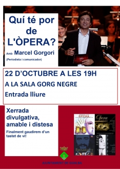 Portada > Actualitat > Agenda > Quí té por de L'ÒPERA? Quí té por de L'ÒPERA? Dia i hora: dissabte 22/10/2022 a les 19:00h Lloc: Sala Gorg Negre Organitza: Ajuntament de Gualba Xerrada divulgativa, amable i distesa amb el periodiste i comunicador Marcel Gorgori Finalment gaudirem d'un tastet de vi! Entrada lliure