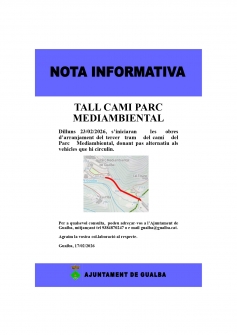 17/02/2026Dilluns, 23.02.2026, s'iniciaran les obres d'arranjament del tercer tram del camí del Parc Mediambiental, donant pas alternatiu als vehicles que circulin. Per a qualsevol consulta, podeu adreçar-vos a l'Ajuntament de Gualba, mitjançant telf 938487027...Arxivat a: General